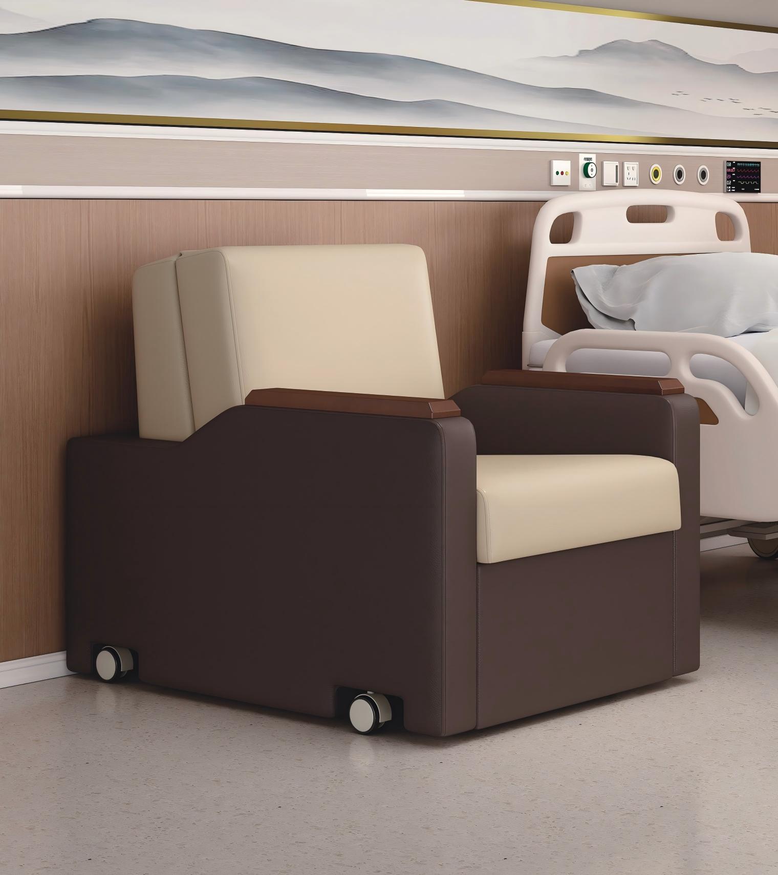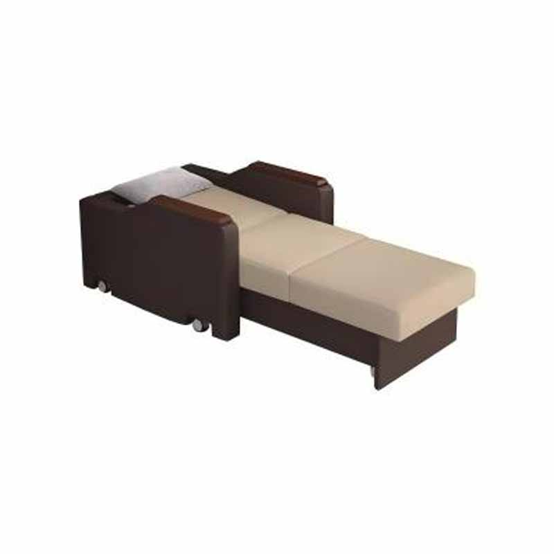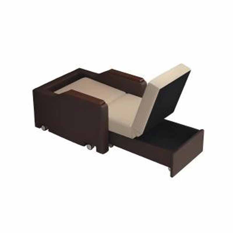 Кресло выполнено в стиле дивана. Обивка изготовлена из экологически чистой каландрированной искусственной кожи PU, подлокотники – из массива дерева, а каркас частично выполнен из стали. Встроенный отсек для хранения вещей и скрытые бесшумные ролики. Внутри кресла установлены телескопические элементы, обеспечивающие плавное и легкое выдвижение и складывание.
